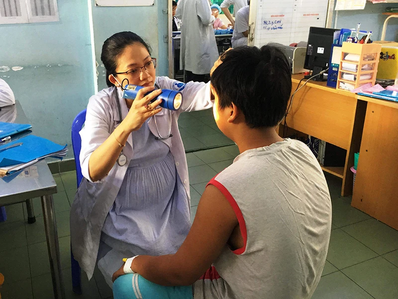 Bác sĩ khoa Nhiễm-Thần kinh BV Nhi đồng 1 (TP.HCM) đang khám thần kinh cho trẻ. Ảnh: HL