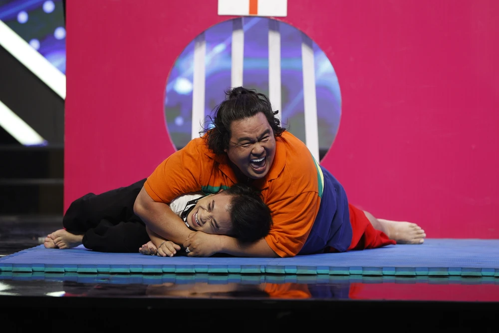 "Gã khổng lồ” Hoàng Mập đàn áp anh bạn nhỏ “tí hon” diễn viên Xuân Tiến. Ảnh: SEN VÀNG