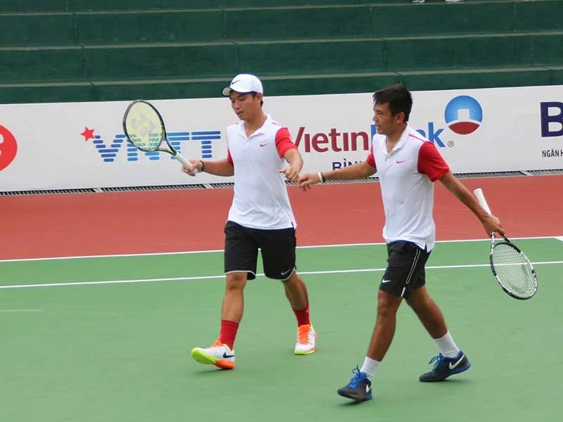 Hoàng Thiên - Hoàng Nam sau chiến thắng trước đôi hạt giống số 1 của giải. Ảnh: MQ