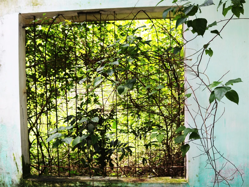 Một cửa sổ được "ngụy trang" bằng cây cối do thời gian không sử dụng quá lâu.