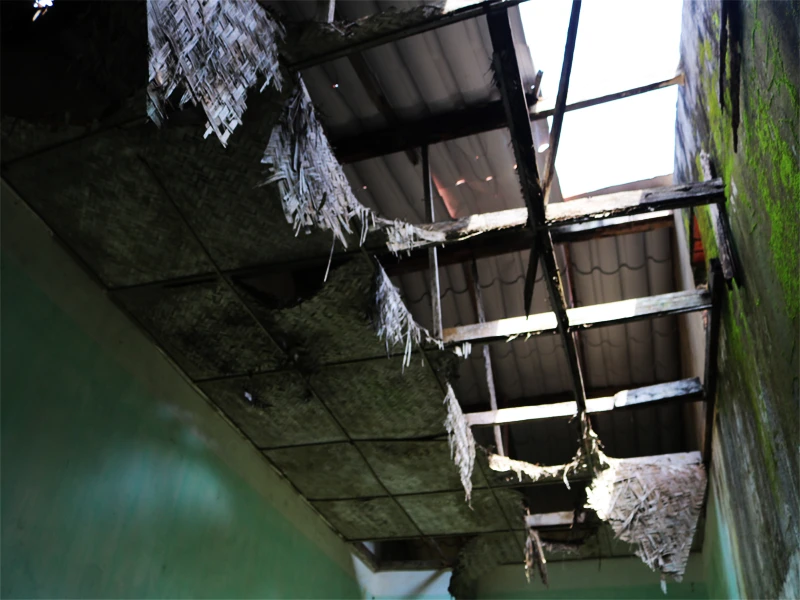 Hầu hết các phòng trong khu tái định cư đều hư hỏng nặng, phần trần nhà chỉ còn lại là những thanh gỗ ngổn ngang có thể rơi xuống bất cứ lúc nào.