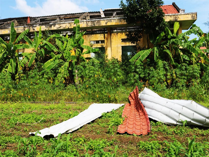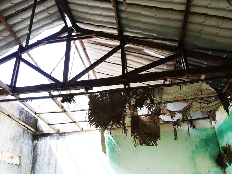 Mái tôn của dãy phòng dài đã bị gió bão cuốn phăng xuống đất.