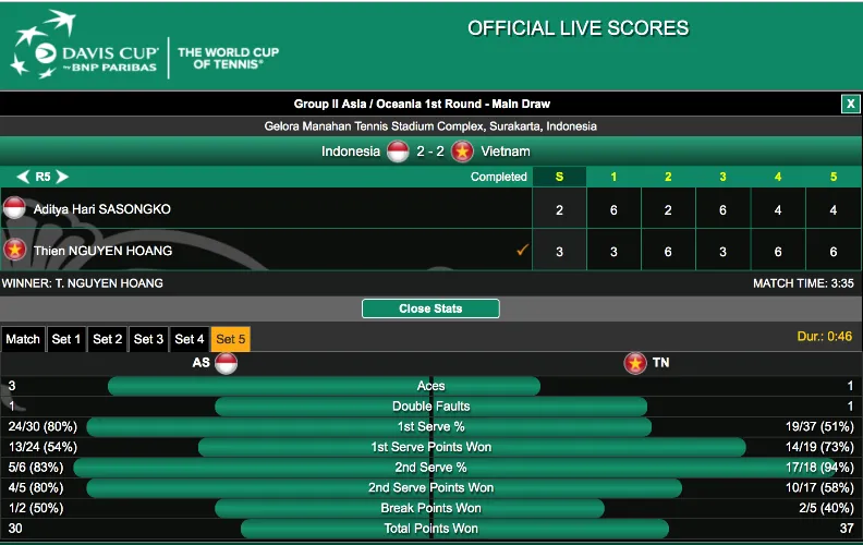 Với chiến thắng bất ngờ của Nguyễn Hoàng Thiên, quần vợt Việt Nam lần đầu tiên lọt vào vòng 2 nhóm II Davis Cup 2016