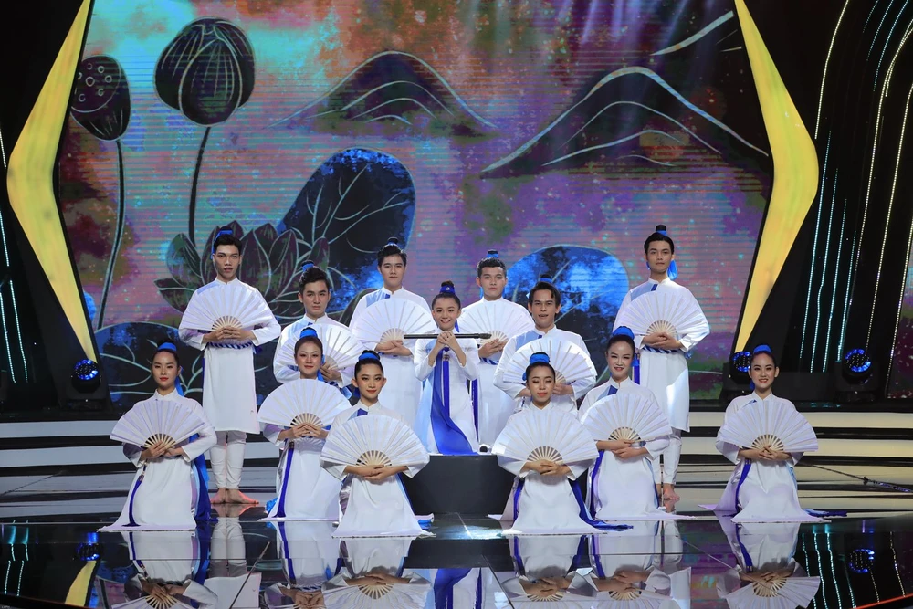 Phần thi nhóm với bài hát Đất nước lời ru trong liên khúc cùng tốp 3 được Hoàng Thiên Nga trình diễn một cách hoàn hảo.