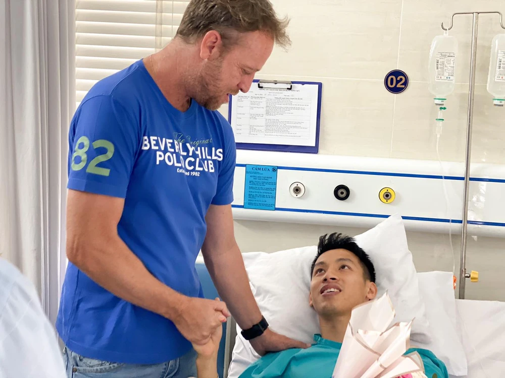 HLV Polking của đội TP.HCM thăm hỏi Hùng Dũng chiều 24-3 trong bệnh viện. Ảnh: TL.