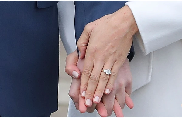 Về nhẫn đính hôn, Harry đã tặng Meghan chiếc nhẫn do chính tay anh thiết kế. Nó được gắn viên kim cương chủ của Botswana, nơi lần đầu tiên hai người hẹn hò và hai viên kim cương phụ từng nằm trong bộ sưu tập cá nhân của công nương Diana. Chuyên gia về trang sức David Allen đánh giá chiếc nhẫn có giá tối thiểu 50.000 bảng (1,5 tỉ đồng). Tuy nhiên, vì có 2 viên kim cương nhỏ từng thuộc về người mẹ quá cố của Harry, nên chiếc nhẫn là vô giá đối với họ.