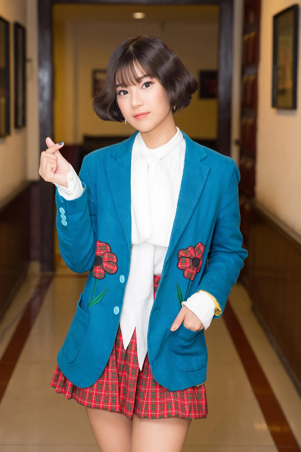 Gây bất ngờ, Hoàng Yến Chibi đã cắt tóc ngắn, lại được duỗi cúp bế tạo nên hình ảnh xì tin, vô cùng đáng yêu. Cô chọn trang phục của một nữ sinh với chân váy ca rô, áo trắng chất liệu voan nữ tính và vest trẻ trung. Hình ảnh này khiến nhiều người nhận xét cô nàng trông một búp bê xinh đẹp. Số khác lại nghĩ ngay đến hình ảnh của những cô gái đôi mươi xứ Hàn.