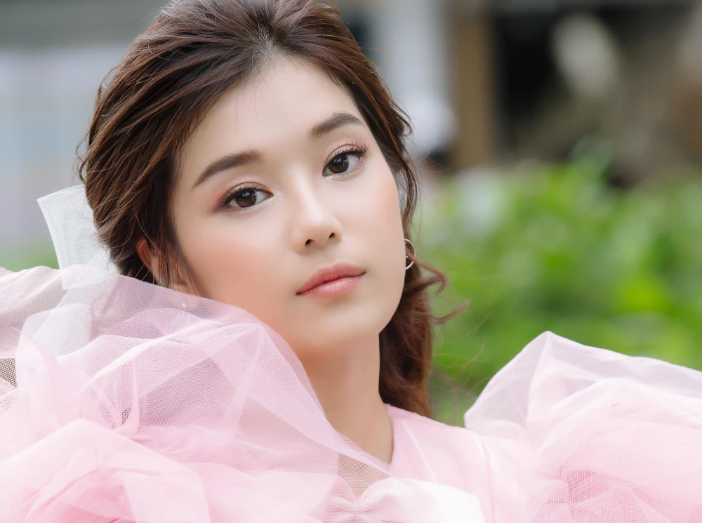 Diện bộ cánh cầu kỳ với chất liệu voan xếp tầng, Hoàng Yến hóa công chúa ngọt ngào. Cách trang điểm “sương sương” càng tôn lên vẻ đẹp nữ tính của nữ diễn viên, ca sĩ 9x.
