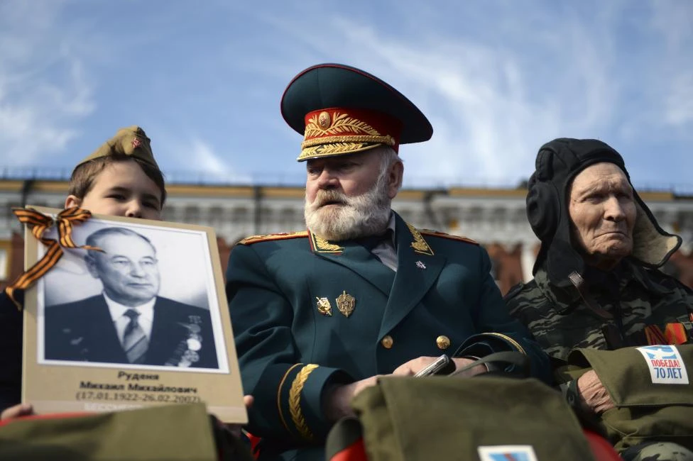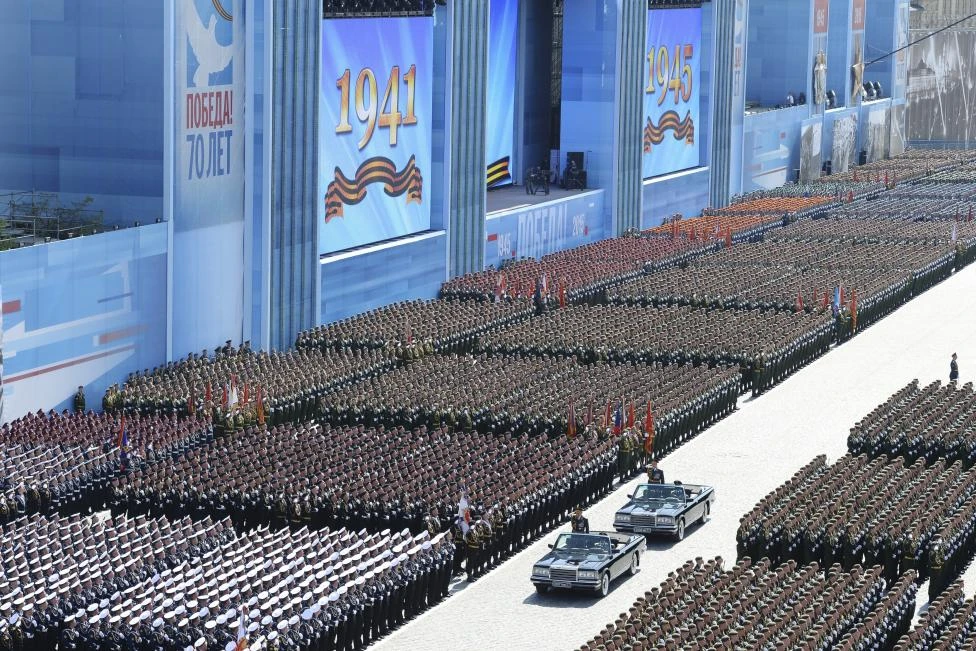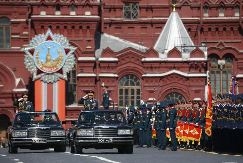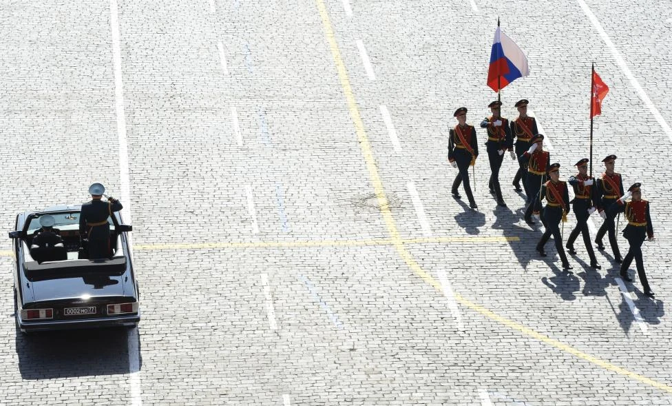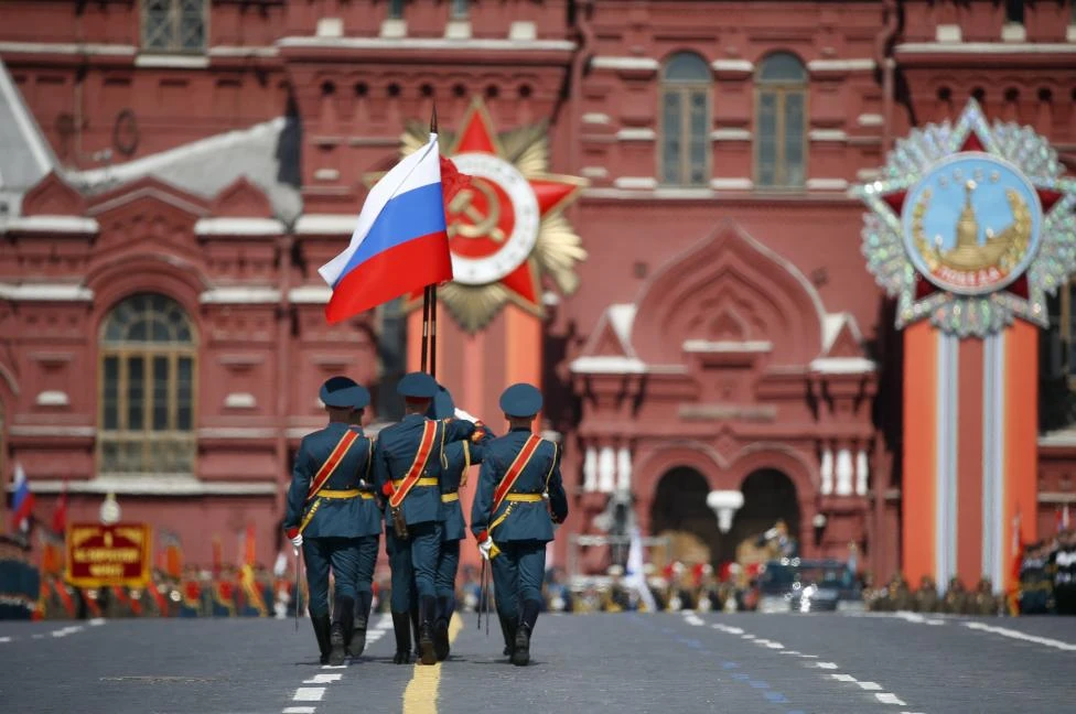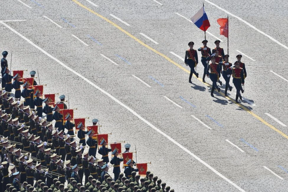 Đội hình cận vệ rước cờ danh dự mở đầu cuộc diễu binh tại Quảng trường Đỏ(Nguồn: Reuters)