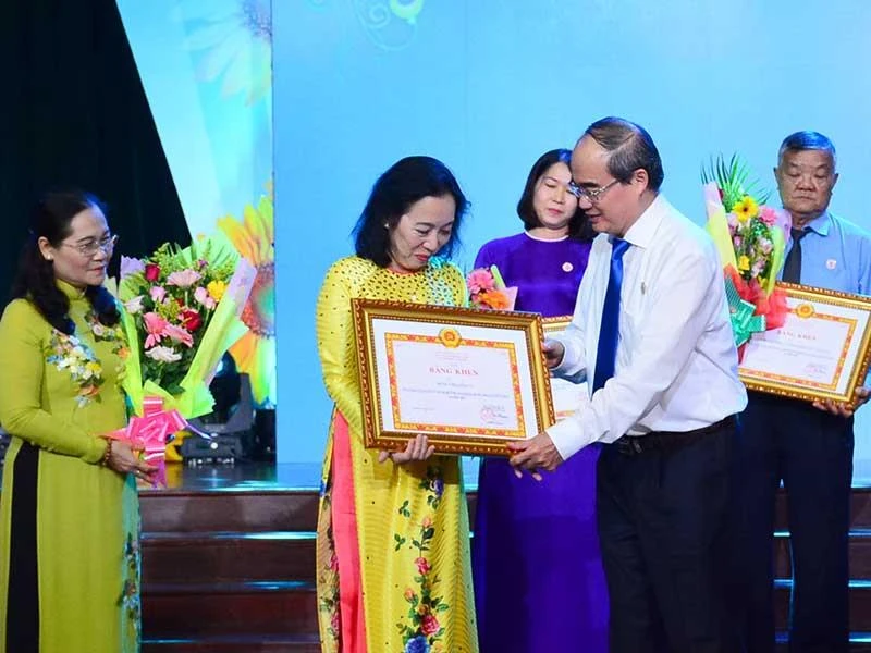 Bí thư Thành ủy TP.HCM Nguyễn Thiện Nhân trao bằng khen cho tập thể và cá nhân thực hiện tốt việc học tập và làm theo tư tưởng, đạo đức, phong cách Hồ Chí Minh năm 2018-2019. Ảnh: TÁ LÂM