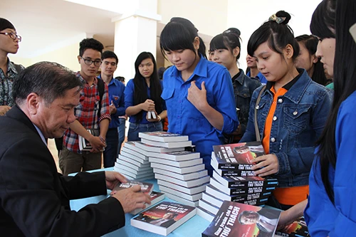 Tác giả ký tặng sách cho sinh viên trường ĐH Yesrsin- Ảnh: TRÀ GIANG