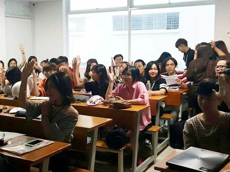 Rất nhiều cánh tay giơ lên khi giảng viên hỏi “Có ai trong số các em không biết học đại học để làm gì?”. Ảnh: HỒNG MINH