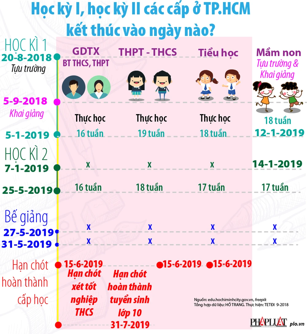 (PLO)- Theo kế hoạch thời gian học năm học 2018-2019 đối với các cấp học ở TP.HCM do UBND TP ban hành, học kì I của các cấp học sẽ kết thúc trong tháng 1-2019, học kì II kết thúc vào ngày 25-5-2019 với thời gian thực học từ 16-19 tuần tùy theo cấp học.