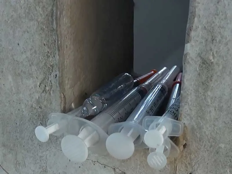 Dọc bờ tường la liệt ống kim tiêm, vỏ tép… “Tình trạng tiêm chích chẳng giảm được phần nào. Ngày ngày họ vẫn tới tiêm chích, vứt ống kim tiêm tràn lan khắp nơi, người dân chúng tôi phải đi dọn” - một người dân sống tại con hẻm phản ánh.