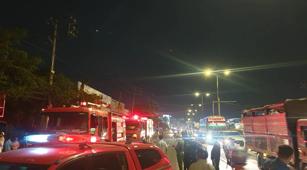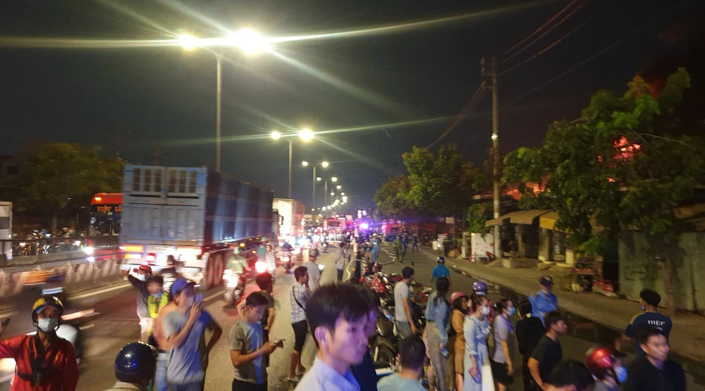 Một làn đường xe máy trên quốc lộ 1 bị phong tỏa khoảng 2 km, giao thông ùn ứ nghiêm trọng. Hiện tại ước tính khoảng hàng ngàn m2 khu vực còn chìm trong biển lửa.