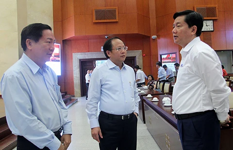 Bí thư Thành ủy TP.HCM trao đổi cùng các đại biểu bên lề hội nghị. Ảnh: TÁ LÂM