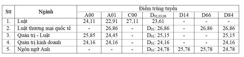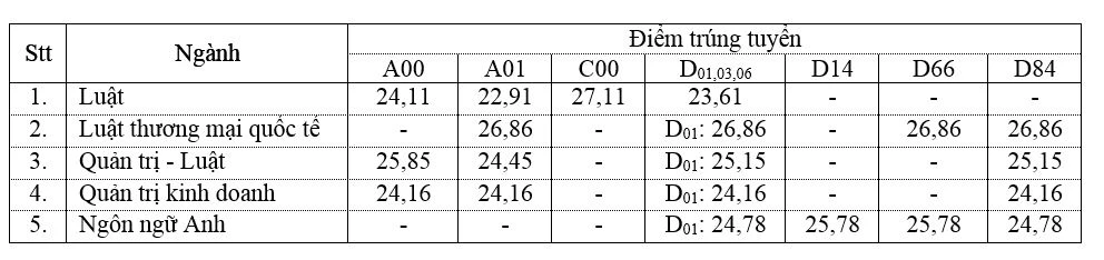 Cạnh đó, ngành luật thương mại quốc tế cũng có mức điểm sàn khá cao, lên đến 26,86 ở cả bốn tổ hợp là A01, D01, D66 và D84.