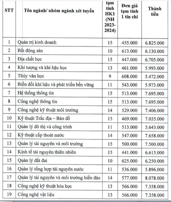 Tương tự, Trường ĐH Tài nguyên môi trường TP.HCM cũng vừa công bố mức học phí năm học 2023-2024 cho từng ngành học cụ thể, áp dụng cho khóa tuyển sinh năm 2023. Nhìn chung, đây là một trong ít trường ĐH có mức học phí thấp hiện nay tại TP.HCM, chỉ trong khoảng 11-16 triệu đồng/năm học.