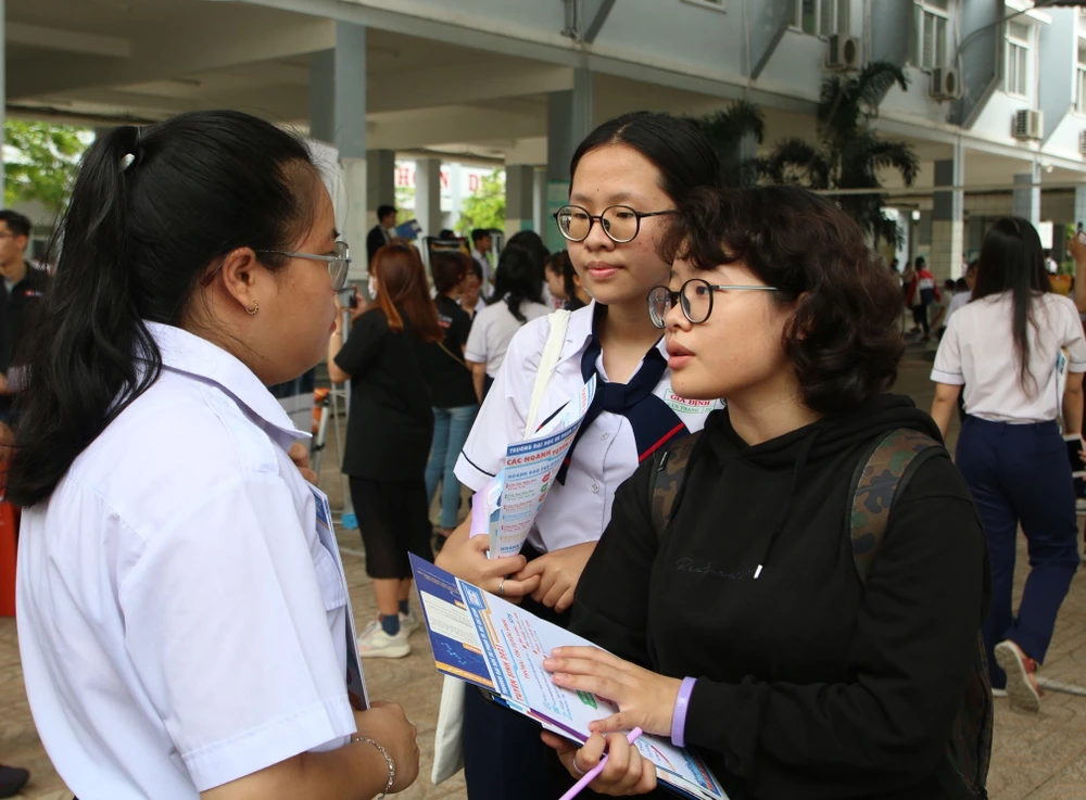 Học sinh Trường THPT Gia Định (TP.HCM) trao đổi thông tin tuyển sinh năm 2021. Ảnh: ĐẶNG TRUNG