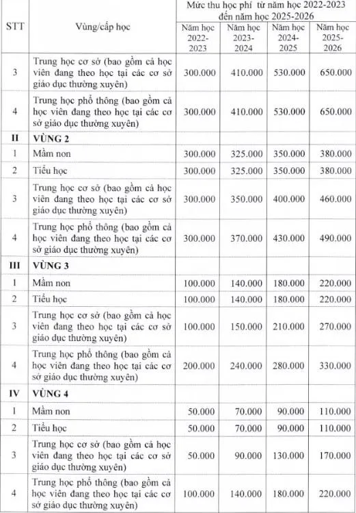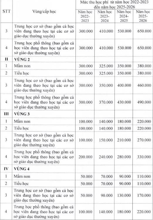 Mức học phí dự kiến áp dụng với các trường mầm non, phổ thông chưa đảm bảo chi thường xuyên (giai đoạn 2022-2026) cụ thể như sau (đơn vị: đồng/học sinh/tháng):