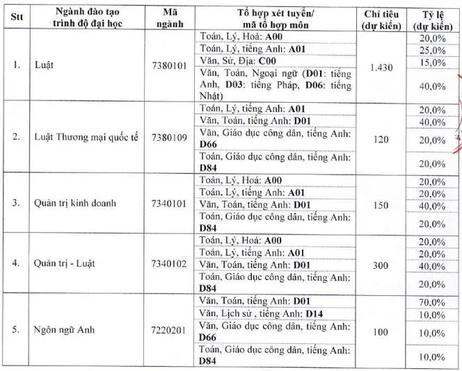 Trong đó, ngành Luật tuyển 381 thí sinh, ngành Luật (đào tạo chất lượng cao) tuyển 241 chỉ tiêu. Ngành Luật kinh doanh tuyển 222 chỉ tiêu, 101 là chỉ tiêu của ngành Luật thương mại quốc tế.