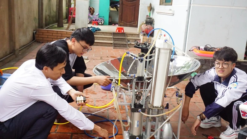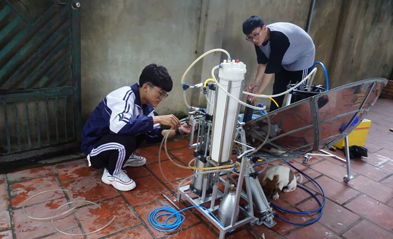Em Nhật Anh (trái) và bạn Văn Long đang kiểm tra dự án thiết bị "hô biến" nước mặn thành nước ngọt bằng năng lượng sóng biển.
