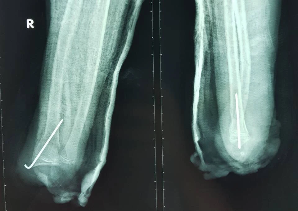 Hình chụp X-quang cho thấy xương các ngón bàn tay phải của em Đ. bị gãy nhiều đoạn nhỏ. Ảnh: HÒA KHÁNH