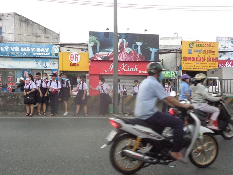Dù thời điểm buổi trưa hay buổi chiều, lượng xe cộ lưu thông qua đây rất lớn, nhất là vào giờ công nhân đi làm và tan ca thì việc nhiều tốp học sinh băng qua đường bằng cách leo qua dải phân cách trở thành mối nguy hiểm xảy ra bất cứ lúc nào (ảnh 1 và 2).