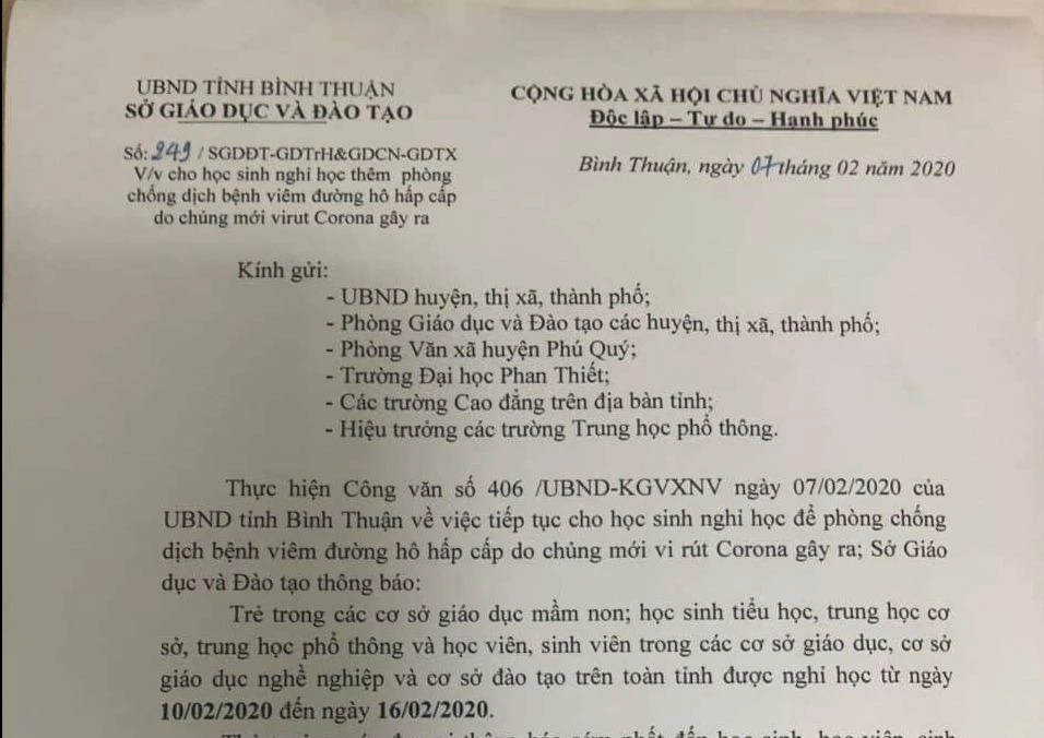 Đến chiều nay (7-2), sau khi lấy ý kiến và được sự đồng ý của UBND tỉnh, ông Thái tiếp tục ký thông báo cho học sinh tỉnh Bình Thuận được nghỉ nối dài từ ngày 10 đến ngày 16-2.