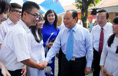 Bí thư Thành ủy TP.HCM Lê Thanh Hải thăm hỏi học sinh Trường THPT chuyên Lê Hồng Phong nhân ngày khai giảng. Ảnh: HTD