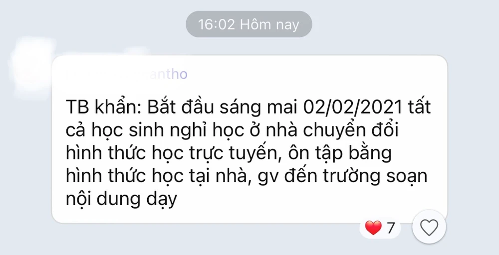 Học sinh một lớp tiểu học ở quận Bình Thủy cũng được giáo viên chủ nhiệm thông báo cho các em nghỉ học ở nhà từ ngày 2-2, chuyển sang hình thức học trực tuyến như đợt nghỉ trước. Theo đó, giáo viên chủ nhiệm soạn nội dung bài học rồi gửi qua nhóm chat trên mạng xã hội cho phụ huynh của các em để học bài và ôn bài.