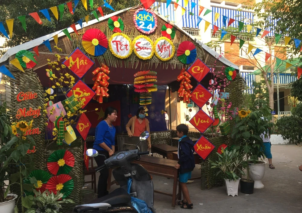 Một trường tổ chức cho học sinh vui chơi đón tết tại trường nhưng các em chưa kịp chơi được bao nhiêu thì cô trò đã phải dọn dẹp vì lịch nghỉ tết sớm đột xuất vào chiều 1-2. Ảnh: NN
