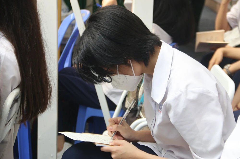 HS ghi chú lại những kiến thức học được từ buổi giao lưu. Ảnh: THẢO PHƯƠNG