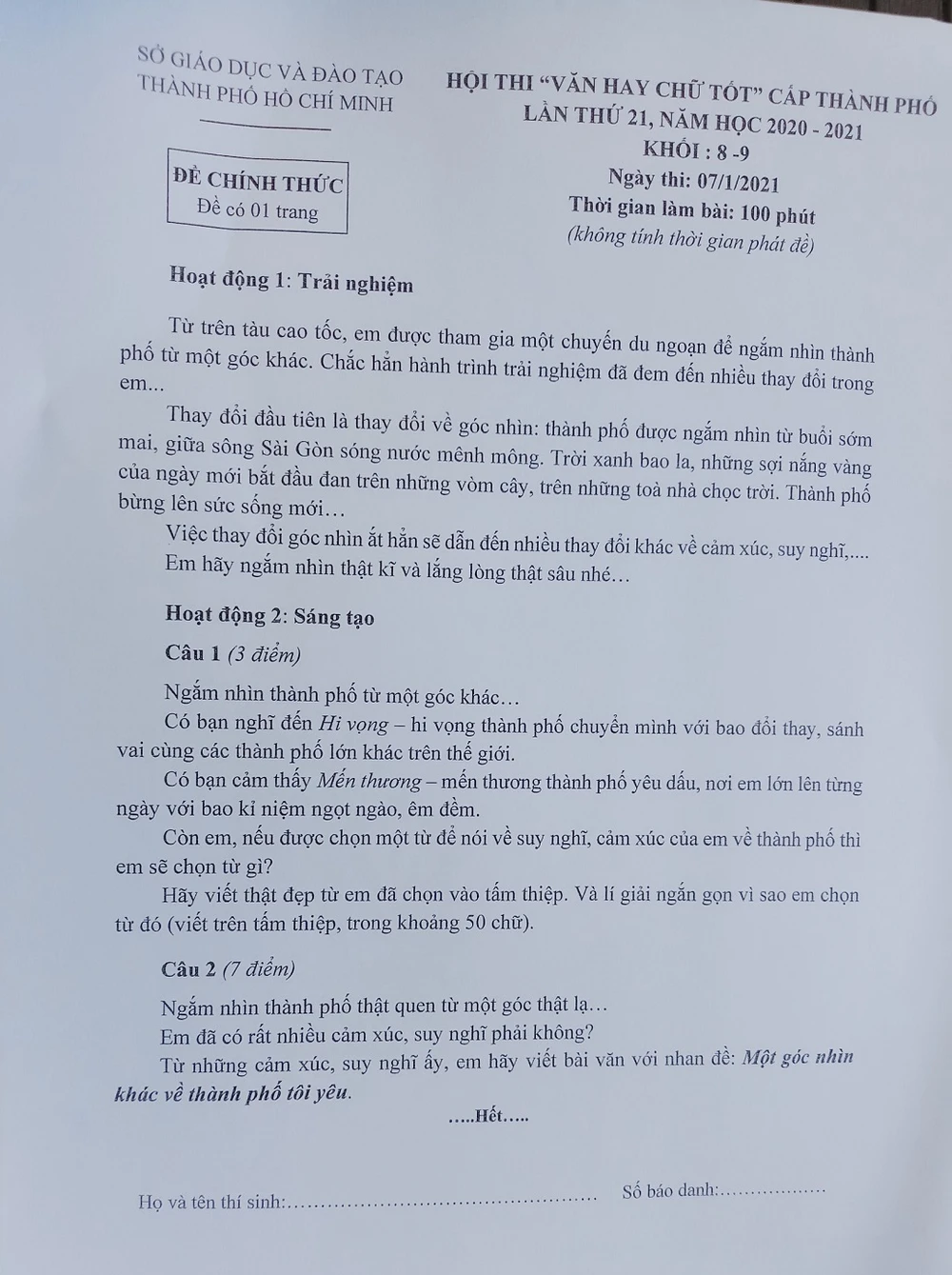 Đề thi khối 6-7 giống như đề thi khối 8-9, chỉ khác ở câu 2 phần sáng tạo. Đề yêu cầu: "Ngắm nhìn TP thật quen từ một góc thật lạ, em đã có rất nhiều cảm xúc phải không? Từ những cảm xúc ấy, em hãy sáng tác một bài thơ/ kể một câu chuyện hoặc viết một bài văn biểu cảm về cuộc dạo chơi ngắm nhìn TP sáng nay với nhan đề: Hành trình trải nghiệm- Hành trình cảm xúc".