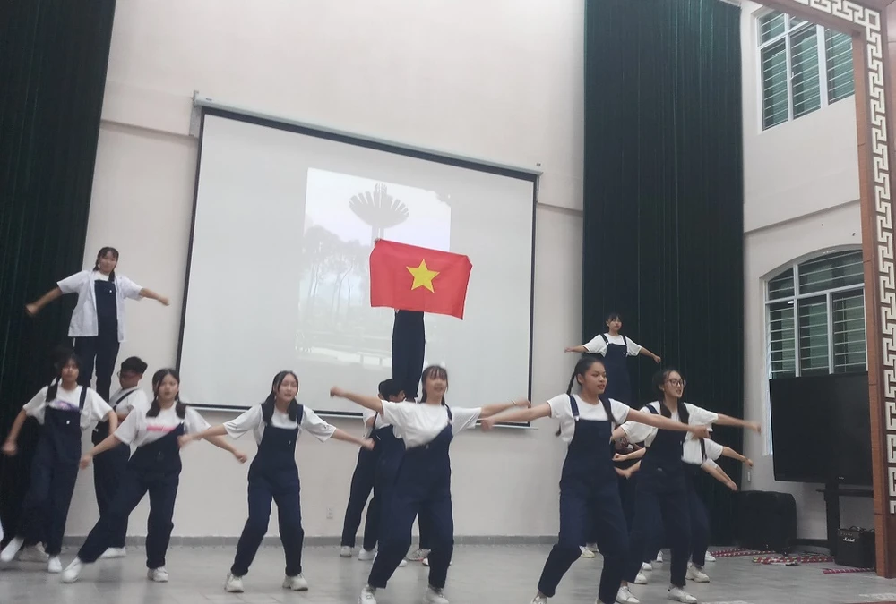 Tiết mục flashmob của học sinh trường THPT Lê Thị Hồng Gấm tại buổi báo cáo dự án. Ảnh: NGUYỄN QUYÊN
