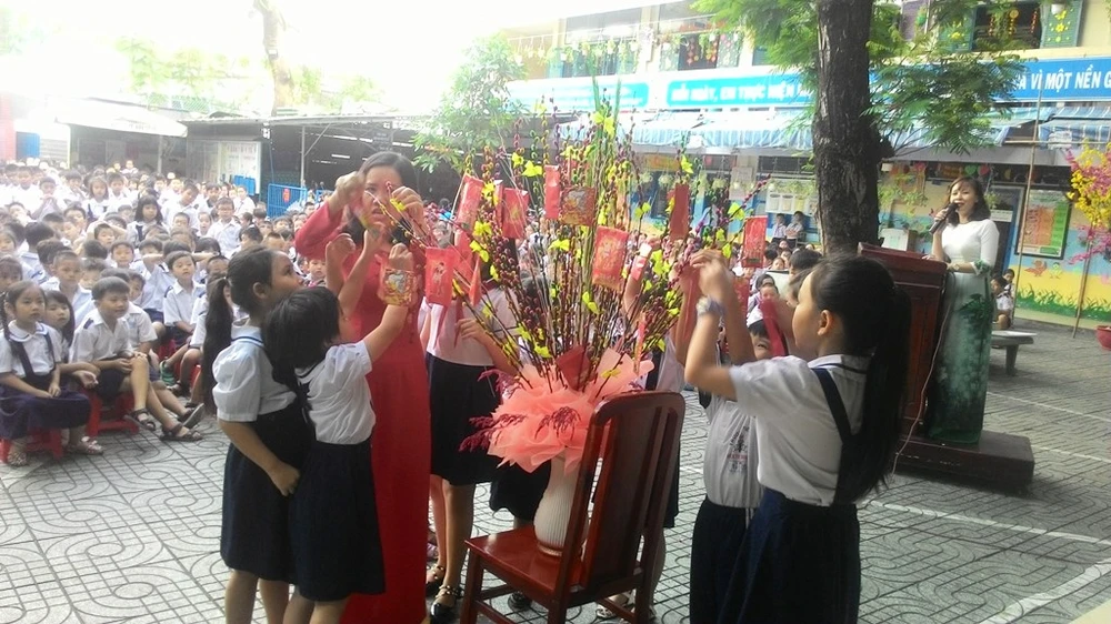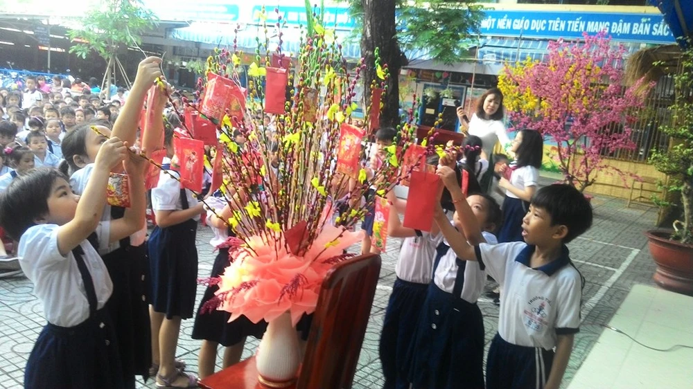 Tại Trường Tiểu học Nguyễn Thị Minh Khai, quận Gò Vấp, trong buổi chào cờ đầu tiên của năm Mậu Tuất, ban giám hiệu nhà trường đã gửi lời chúc mừng năm mới tới toàn thể giáo viên cũng như học sinh của trường. Bên cạnh đó, để tạo sự hứng thú cho các em, nhà trường còn có một số tiết mục văn nghệ, tổ chức trò chơi “hái lộc đầu xuân” và lì xì cho các em lớp trưởng, sao đỏ của trường. Hầu hết các em học sinh đều cảm thấy thích thú với trò chơi “hái lộc đầu xuân”. Mỗi một câu trả lời đúng, các em đều được nhận một phần quà thú vị.