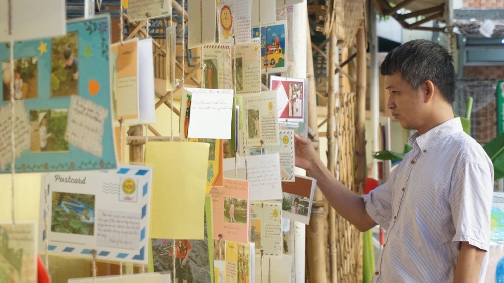 Phu huynh xem các bưu thiếp do học sinh lớp 1 tự tay làm. Ảnh: NGUYỄN QUYÊN