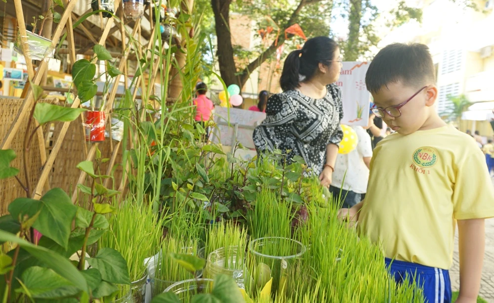Tại ngày hội, Đặng Nguyên Bảo, học sinh lớp 1 tự tin giới thiệu đến mọi người về gian hàng trưng bày các chậu cây xanh tốt do chính em và các bạn trồng, chăm sóc trong suốt thời gian qua.