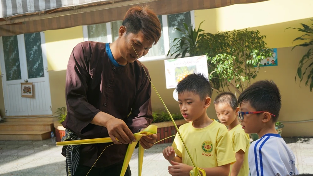 Học sinh thích thú với gian hàng làm cào cào bằng lá dừa. Ảnh: NGUYỄN QUYÊN