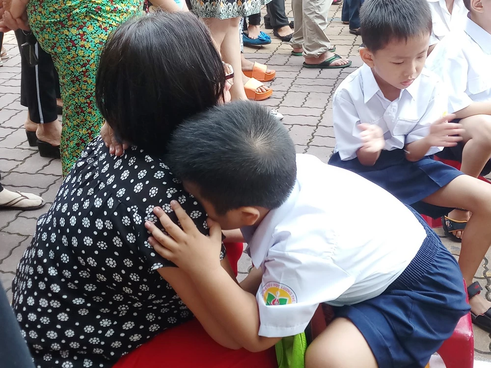 Một HS lớp 1 cứ ôm chặt mẹ không rời.