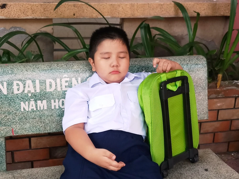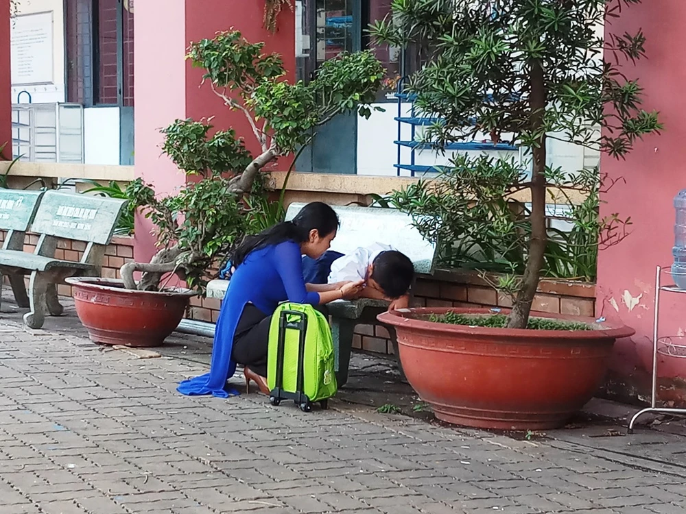 Trong khi các bạn cùng lứa đã vào lớp thì cậu bé ôm cặp ra ghế khóc, đòi về với mẹ.