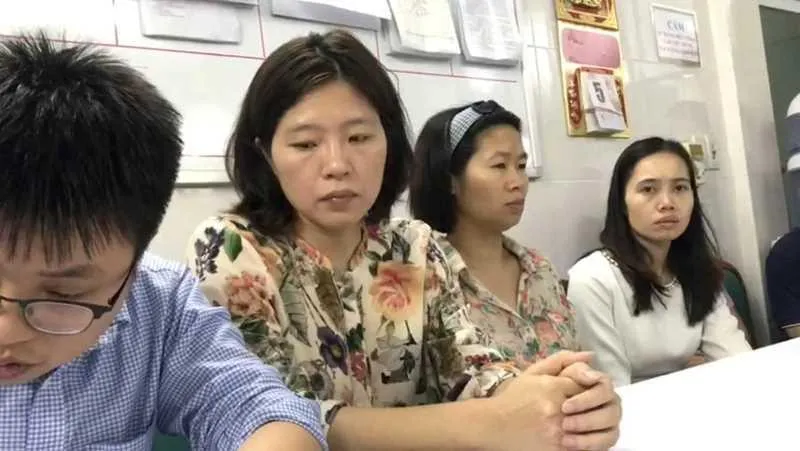 Bà Trần Thị Hồng Hạnh (thứ hai, từ trái sang), Chủ tịch HĐQT Trường quốc tế Gateway làm việc với cơ quan chức năng và gia đình cháu L tại Bệnh viện E tối 6-8