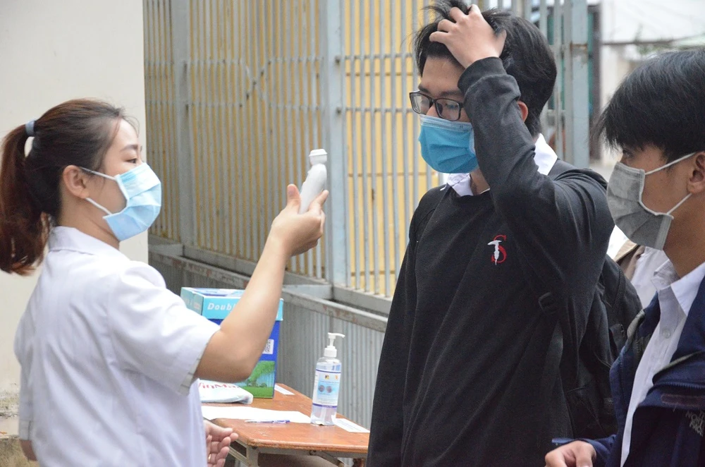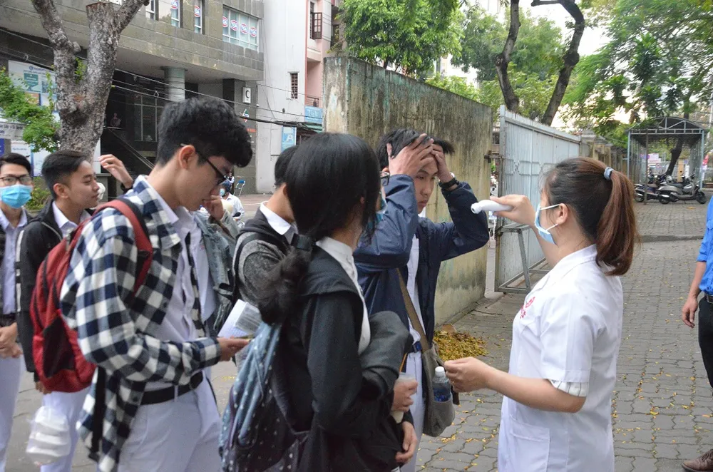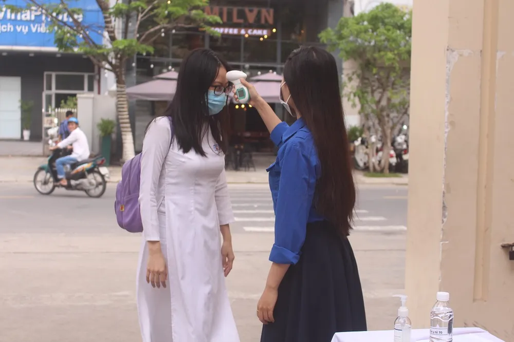 Cán bộ y tế đo thân nhiệt cho học sinh tại Trường THPT Phan Châu Trinh. Ảnh: T.AN