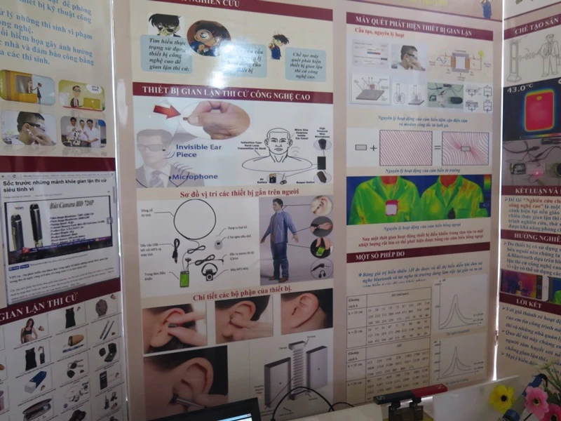Về lý do thực hiện đề tài này, hai em cho biết do hiện nay công nghệ ngày càng phát triển nên các thiết bị gian lận công nghệ cao cũng càng tinh vi hơn như tai nghe siêu nhỏ, bút camera... việc phát hiện và ngăn chặn vô cùng khó khăn.