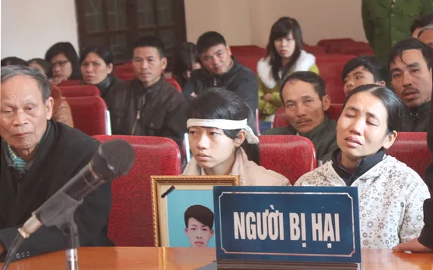 Gia đình nạn nhân đưa di ảnh em em Trần Văn Minh đến tham dự phiên tòa