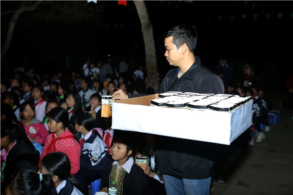 Sự thích thú của các học sinh vùng cao khi được xem phim trên sân trường.