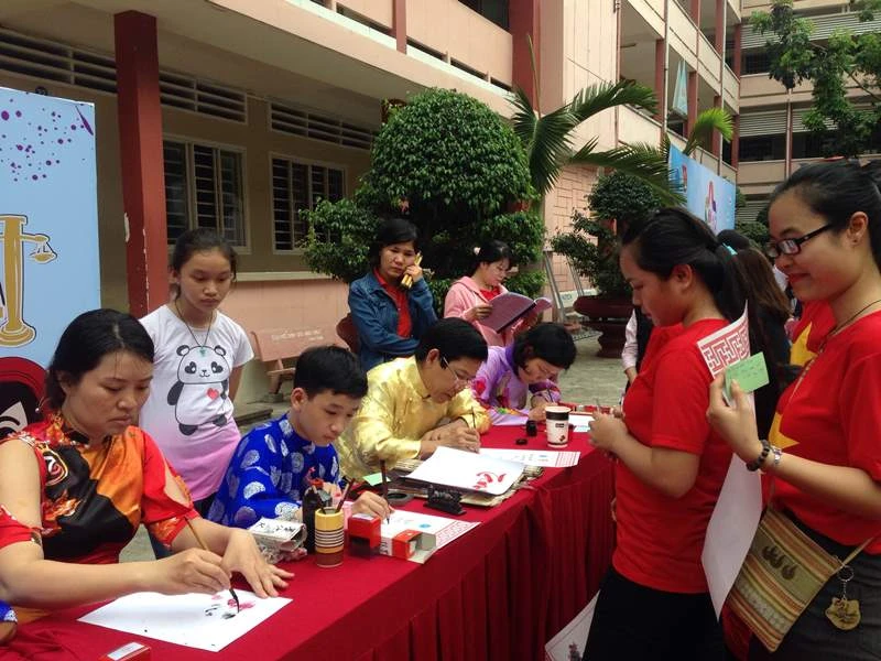 Gian hàng thư pháp thu hút học sinh THPT đến tìm hiểu. Ảnh: P.ĐIỀN