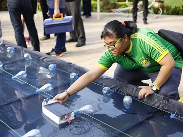 Các thuyền đua lập trình bằng năng lượng mặt trời tranh tài trong thể tích nước được bao bọc bởi tấm bạt không thấm nước hình chữ nhật đặt tại khu E trong khuôn viên rộng lớn của trường.