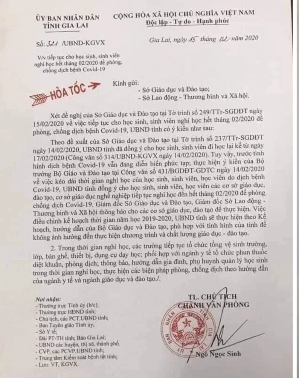 Ngày 15-2, UBND các tỉnh Gia Lai, Đắk Nông, Lâm Đồng, Đắk Lắk... có công văn hỏa tốc thông báo kéo dài thời gian nghỉ học của học sinh, sinh viên, học viên đến hết tháng 2-2020 để phòng, chống dịch COVID-19.