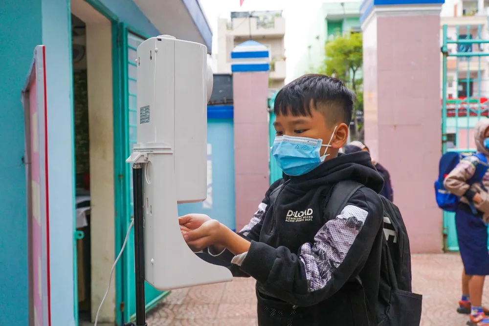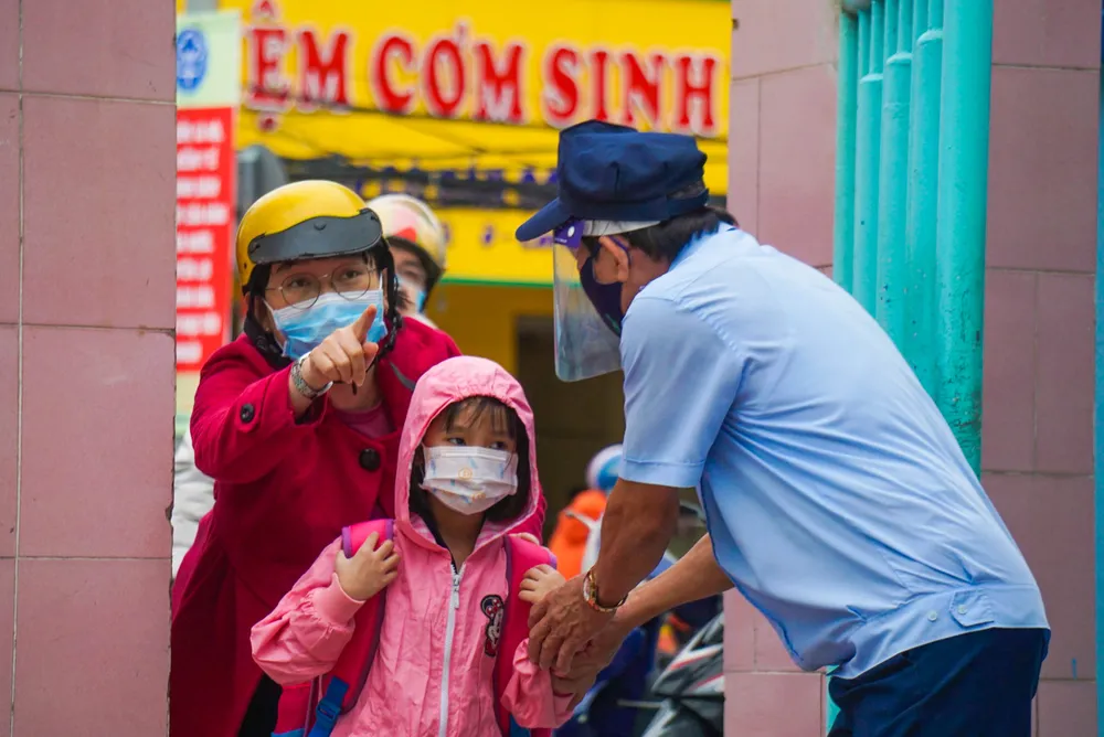 Tại cổng trường, giáo viên túc trực sẵn để phân luồng, kiểm tra thân nhiệt và yêu cầu học sinh rửa tay sát khuẩn trước khi vào lớp. Trong tuần đầu tiên đi học, giáo viên sẽ tổ chức ôn tập cho học sinh kiến thức cũ. Trường hợp f0, f1 sẽ phải ở nhà và tiếp tục học trực tuyến.